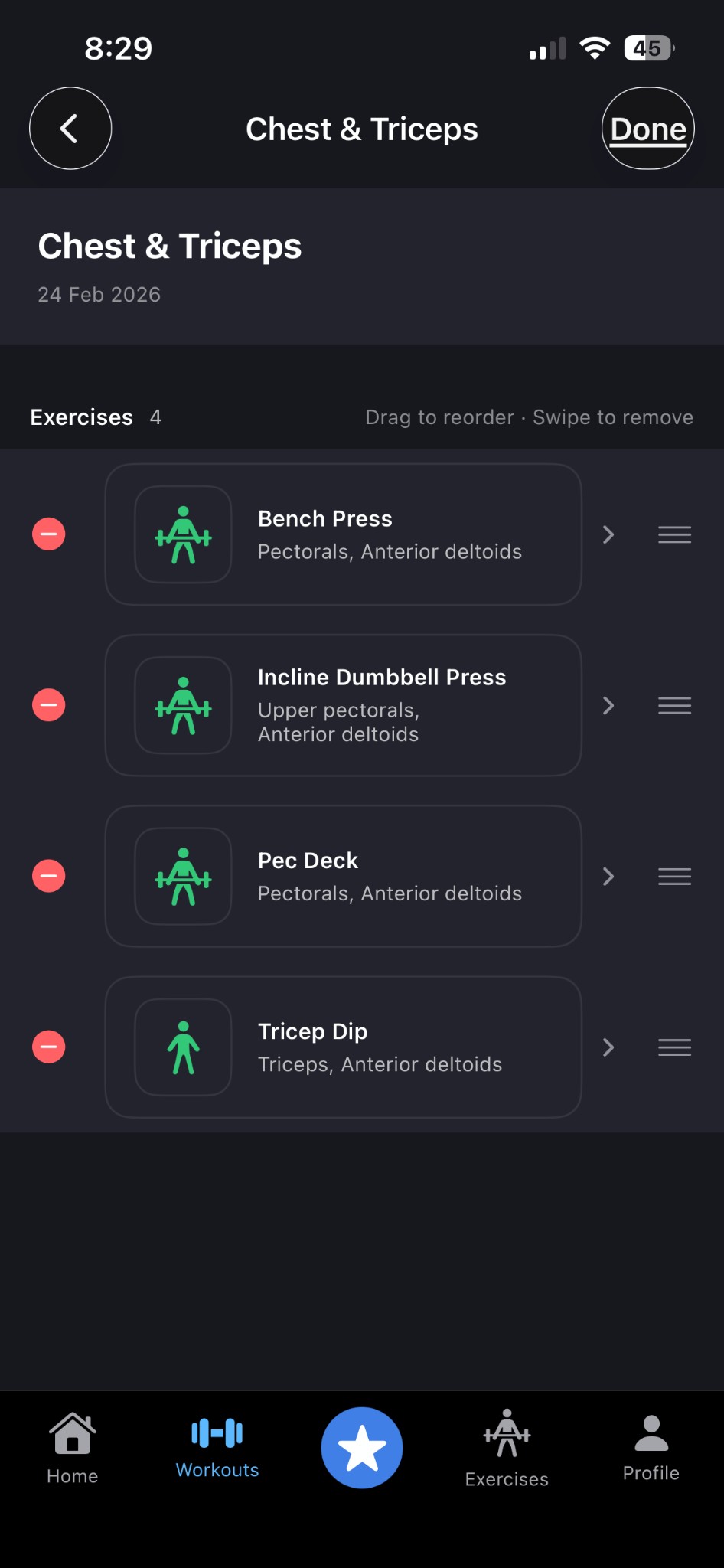 Workout plan editor: reorder exercises, remove items, view target muscles.