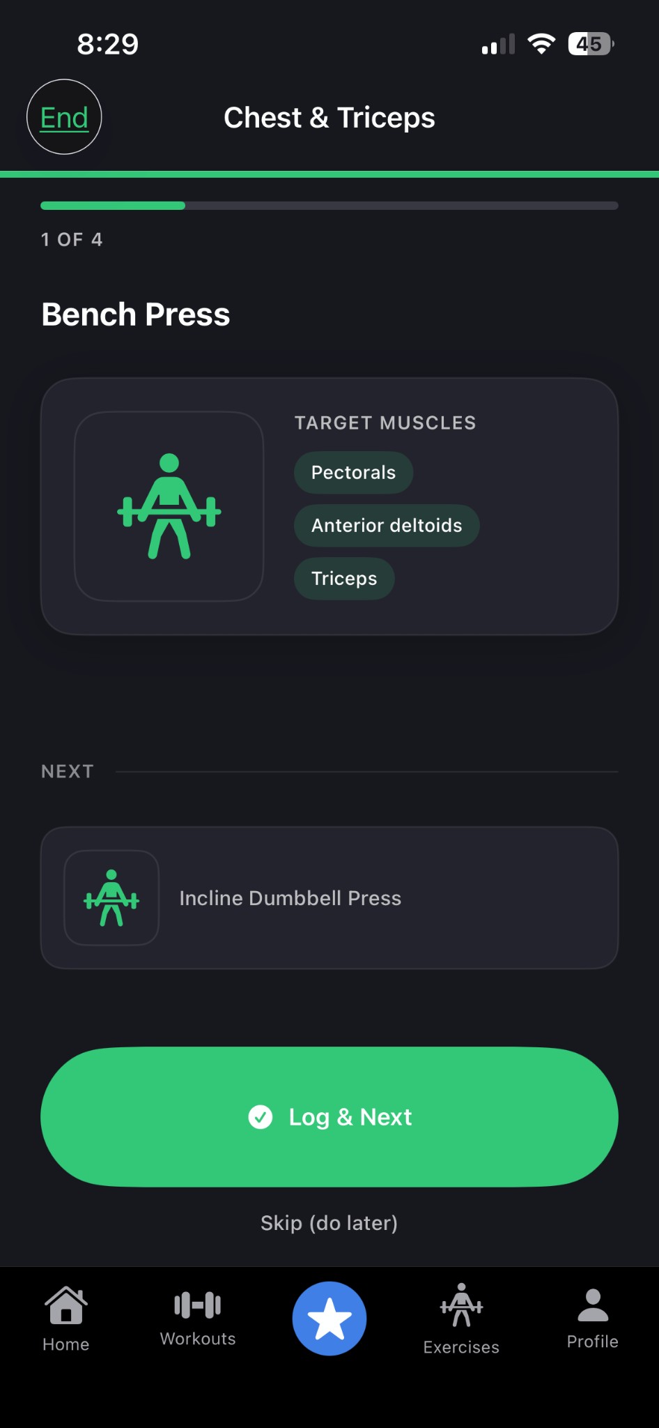Step through exercises with target muscles, log sets, and move to the next—or skip and do later.